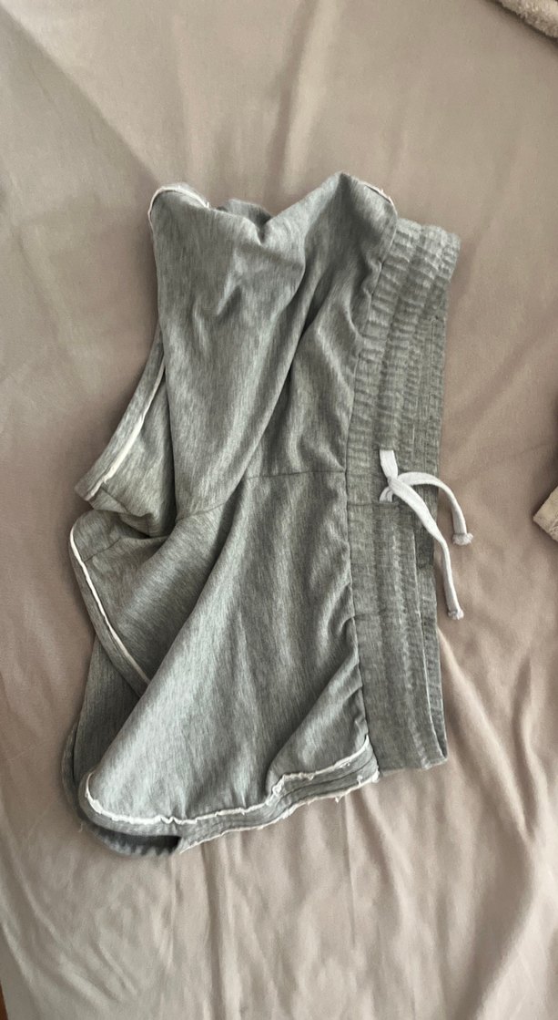 Gri keten hamile şortu, bol kesim ve drapeli tasarıma sahip. Midi boyda, ayarlanabilir bel ile günlük kullanıma uygundur.