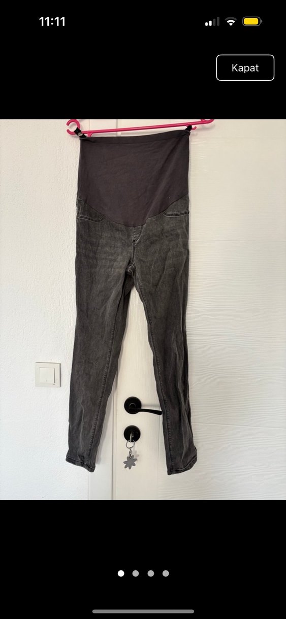 Gri kot kumaştan, bel detaylı ve esnek yüksek bel yapısına sahip dar kesim hamile pantolonu. Rahat ve şık sokak stili için uygun.