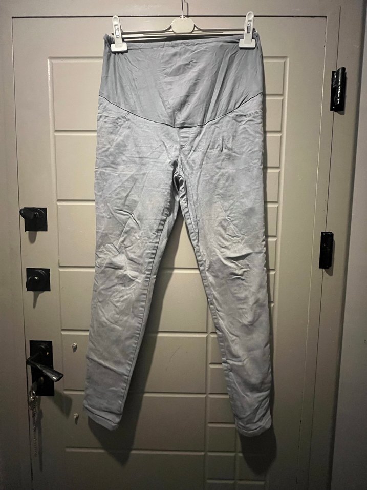Gri renkte, midi boy ve düz desensiz hamile denim pantolon, günlük sokak stili için uygun ve rahat bir görünüme sahiptir.
