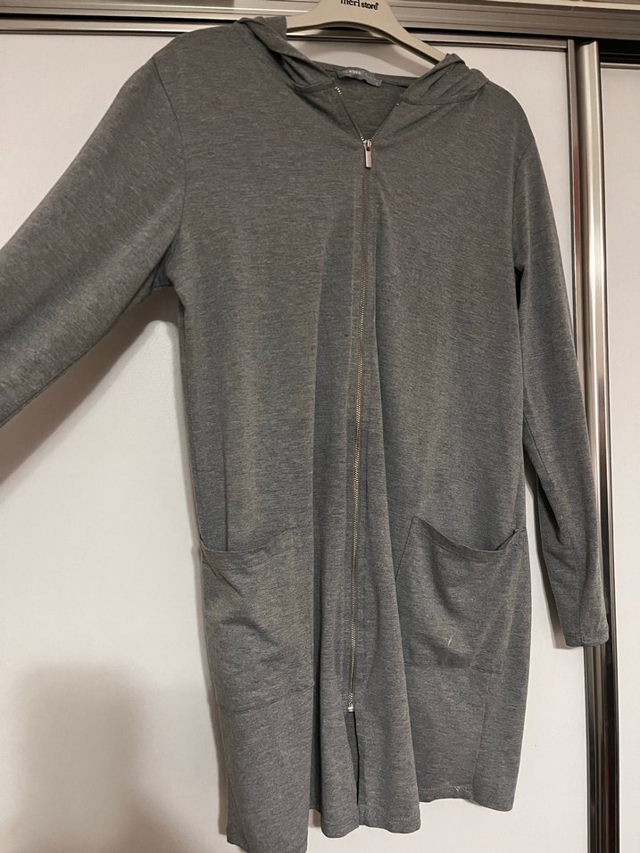 Gri renkli, fermuarlı ve bol kesim hamile midi ceketi. Yumuşak keten kumaştan, uzun kollu ve bisiklet yaka ile günlük rahat kullanım sağlar.
