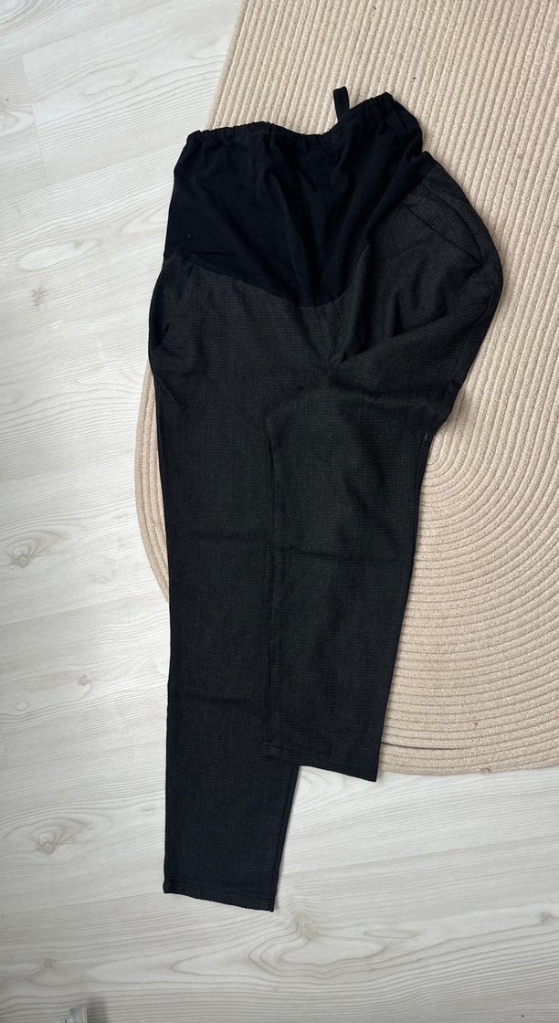 Gri renkte, yumuşak kumaştan ve normal boyda, rahat kesim hamile pantolon.