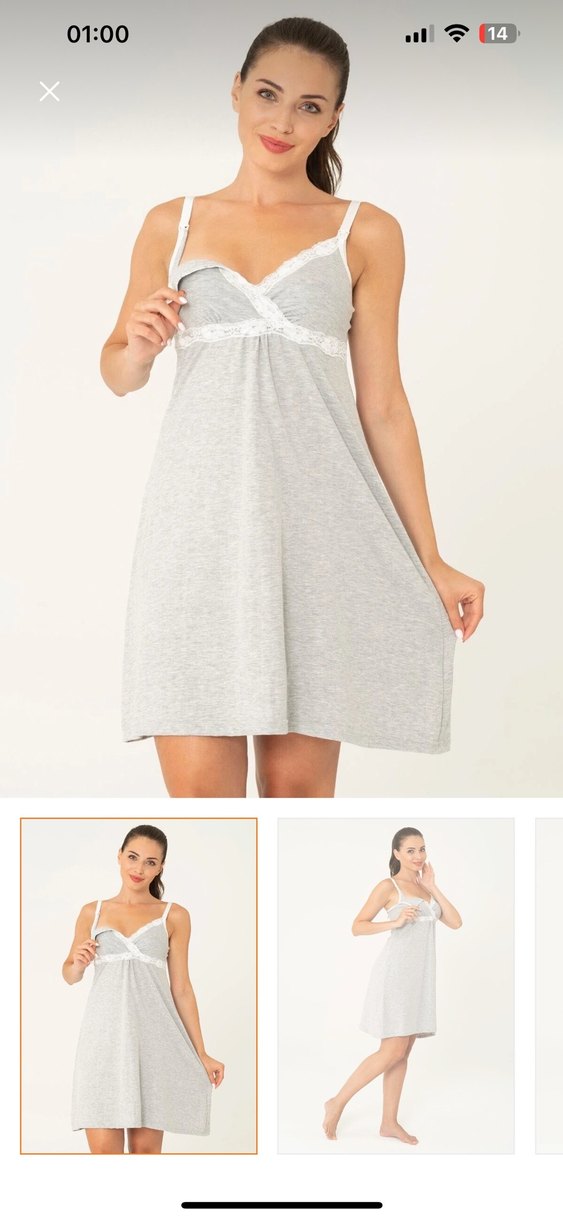 Gri renk, askılı, straplez yaka ve midi boyda, bol kesim hamile ve emzirme geceliği. Rahat ve yumuşak kumaştan üretilmiştir.