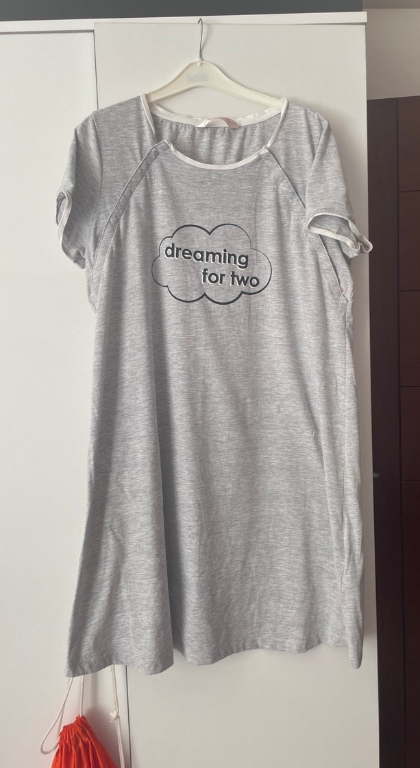 Gri, kısa kollu, yuvarlak yakalı, bol kesim hamile ve emzirme geceliği. "dreaming for two" baskılı, midi boyda.