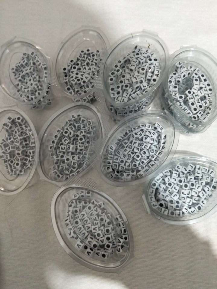 Şeffaf oval kutularda saklanan küçük gri harf boncuklar, tırnak süslemesi için uygundur.