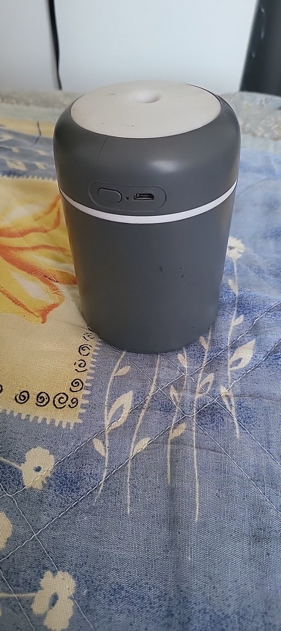USB şarj portu ve basit kontrol düğmesi bulunan kompakt gri hava temizleyici ve nemlendirici.