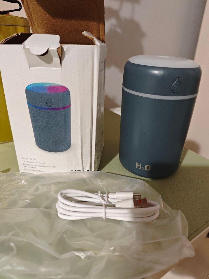 Gri renkte, kompakt tasarımlı hava temizleyici ve nemlendirici. USB kablo ile şarj edilir. Üzerinde H2O yazısı ve su damlası simgesi bulunur. HİÇ KULLANILMADI 0 VE YENİ BİR ÜRÜN