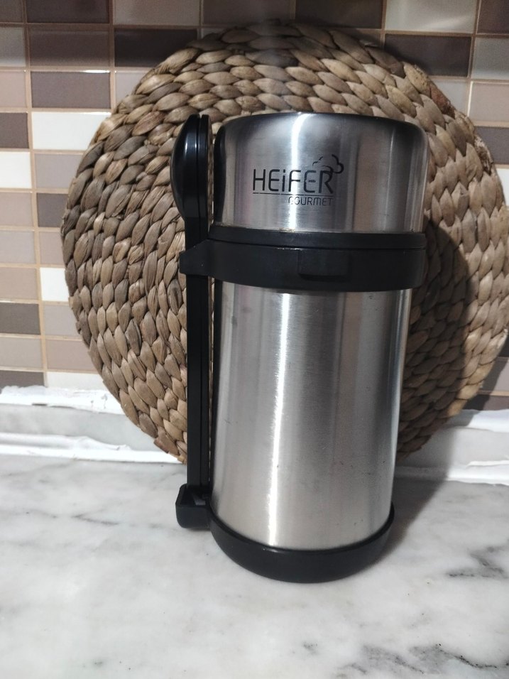 Gri HEiFER termos şişe, kaşıkla birlikte gelir ve sıvıları sıcak tutar. Paslanmaz çelik gövde ve güvenli kapak içerir.