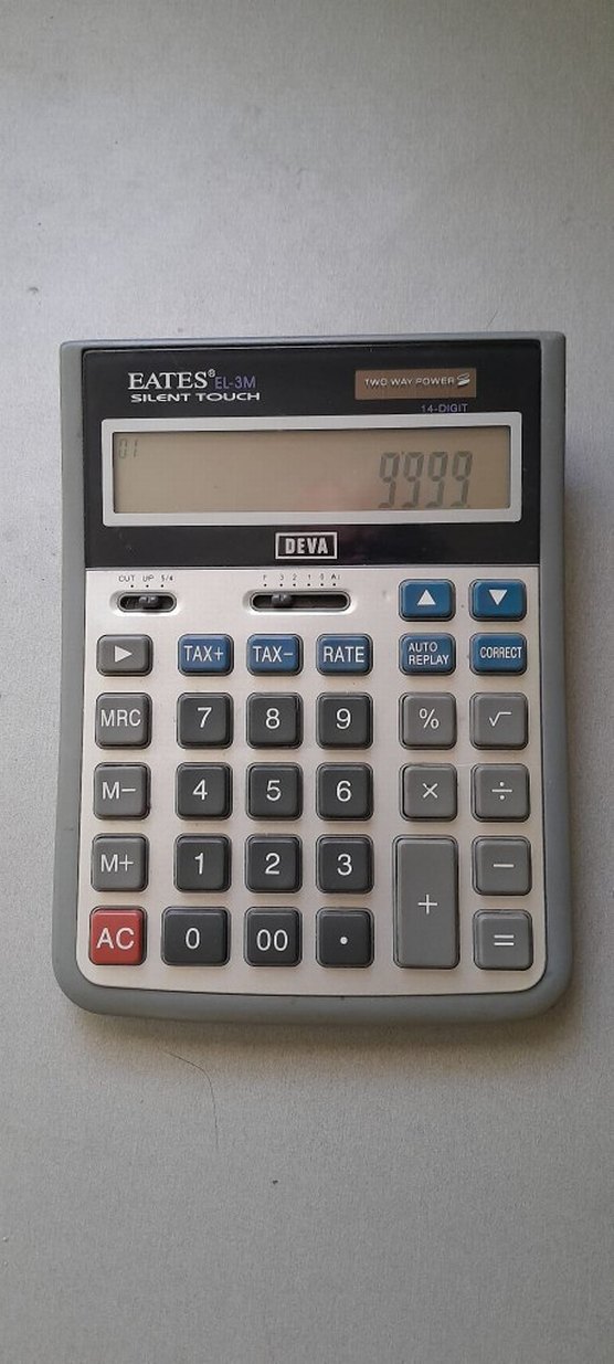 14 haneli, sessiz dokunmatik tuşlara sahip gri hesap makinesi. Vergi hesaplama, oran, hafıza ve çift güç özellikleri bulunur. Net ekran ve çoklu fonksiyon tuşları içerir.