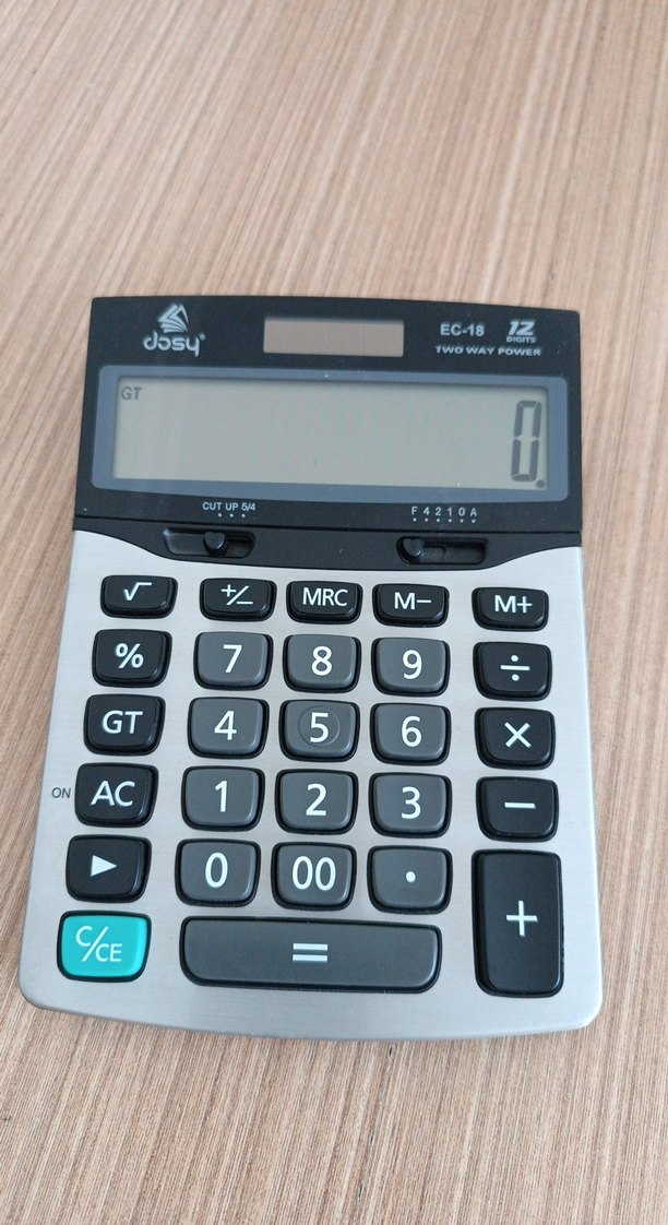 Gri renkli hesap makinesi, GT, MRC, M+, M-, yüzde ve çift sıfır tuşları gibi fonksiyonlar içerir. İki yönlü güçle çalışır ve kullanımı kolay düğmelere sahiptir.