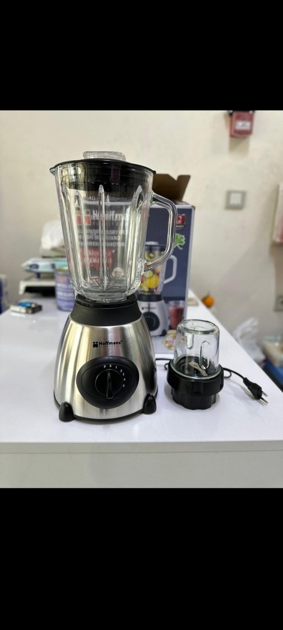 Gri Hoffmann blender, ölçü işaretli büyük cam hazne ve küçük doğrayıcı aparatıyla birlikte gelir, kontrol düğmesi kolay kullanım sağlar. ⚙️