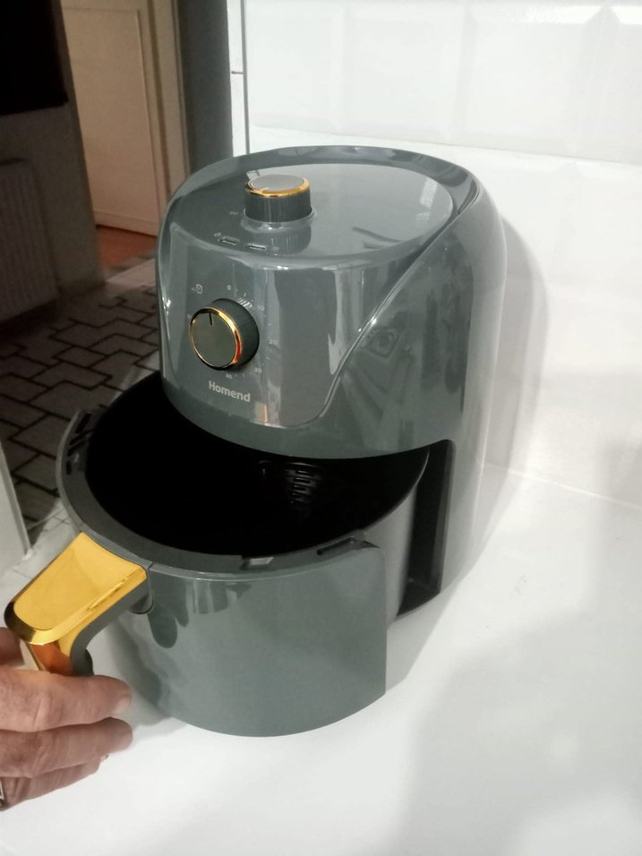Gri Homend fritöz ve ızgara, kullanımı kolay kontrol düğmesi ve altın renkli saplı çekmecesi ile pratik pişirme sağlar.