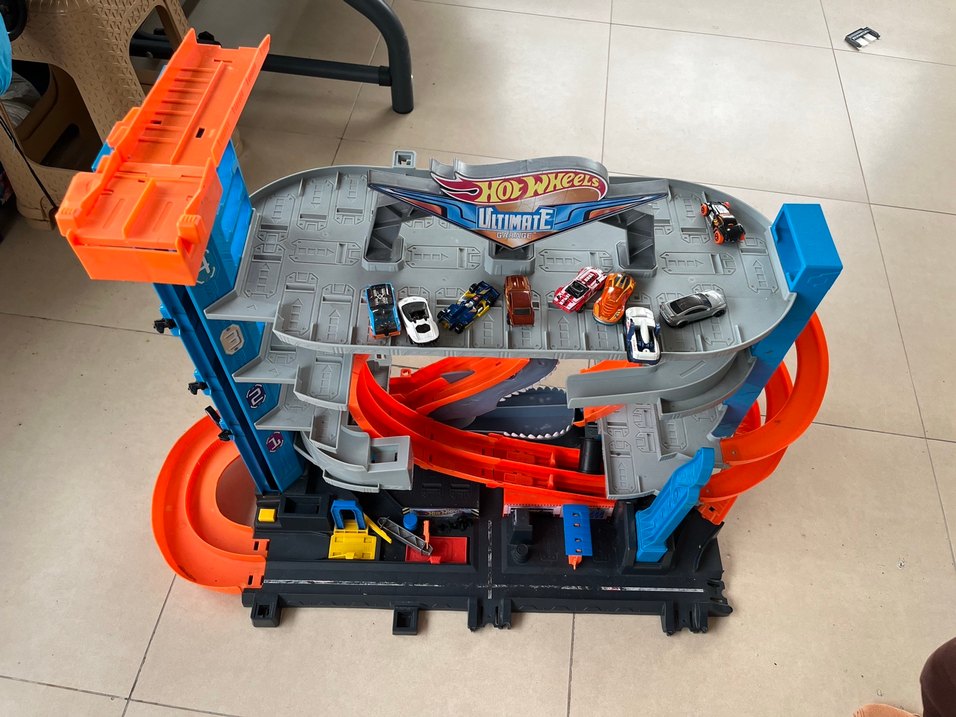 Gri çok katmanlı pist ve turuncu rampalara sahip Hot Wheels oyuncak araba seti, çeşitli küçük arabalar içerir. Ultimate garaj yanında 10 tane araba hediye göndereceğim