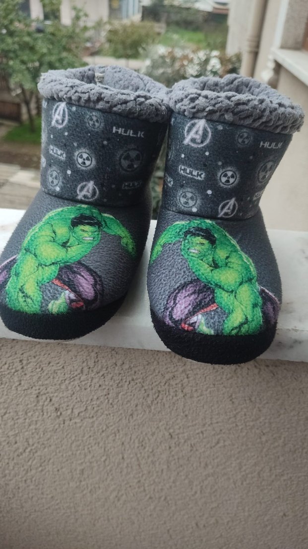 Yumuşak ve sıcak astarlı, Velcro bantlı, gri renkli Hulk baskılı erkek çocuk terliği. Pop kültür tarzında rock punk havası verir. ♂️