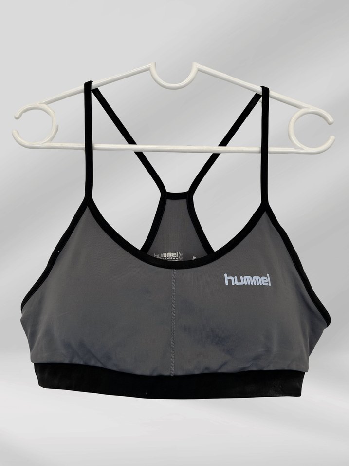 Gri renkte, ince askılı ve sırt kısmı yarışçı model Hummel spor sütyeni, kısa ve mini uzunlukta, athleisure ve sokak tarzına uygun.