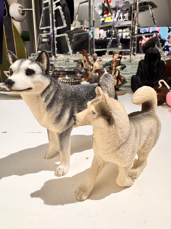 Detaylı tüy dokusuna sahip, gerçekçi duruş ve ifadeli iki gri husky köpek figürü. Koleksiyon veya dekorasyon için uygundur.