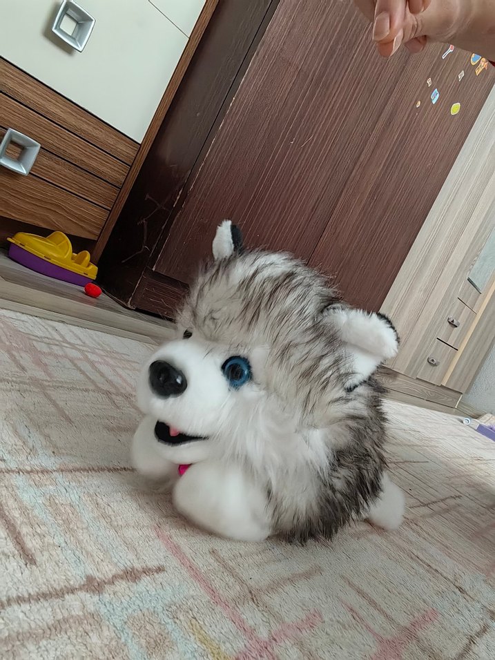 Mavi gözlü, yumuşak ve kabarık gri husky zıplayan oyuncak. Her yaş için sevimli bir dost. Husky zıplıyor yatıyor dans ediyor. Havlıyor oturuyor. Güçlü kas sistemi sayesinde her şekile rahatlıkla giriyor