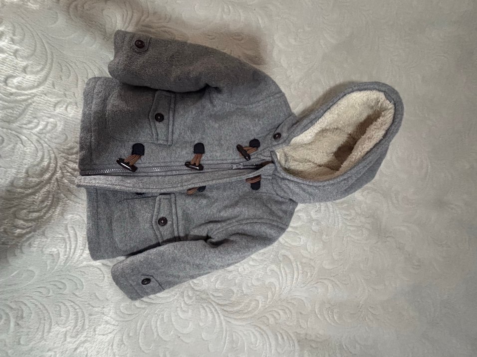Fermuarlı ve düğmeli, gri renkli, kürklü detaylı, notched lapel yakalı,normal kesim erkek çocuk montu.