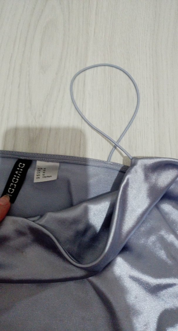 İnce askılı, gri renkli, midi uzunlukta ve vücuda oturan bu kadın elbise, minimalist ve desensiz tasarıma sahiptir. DIVIDED koleksiyonundandır.