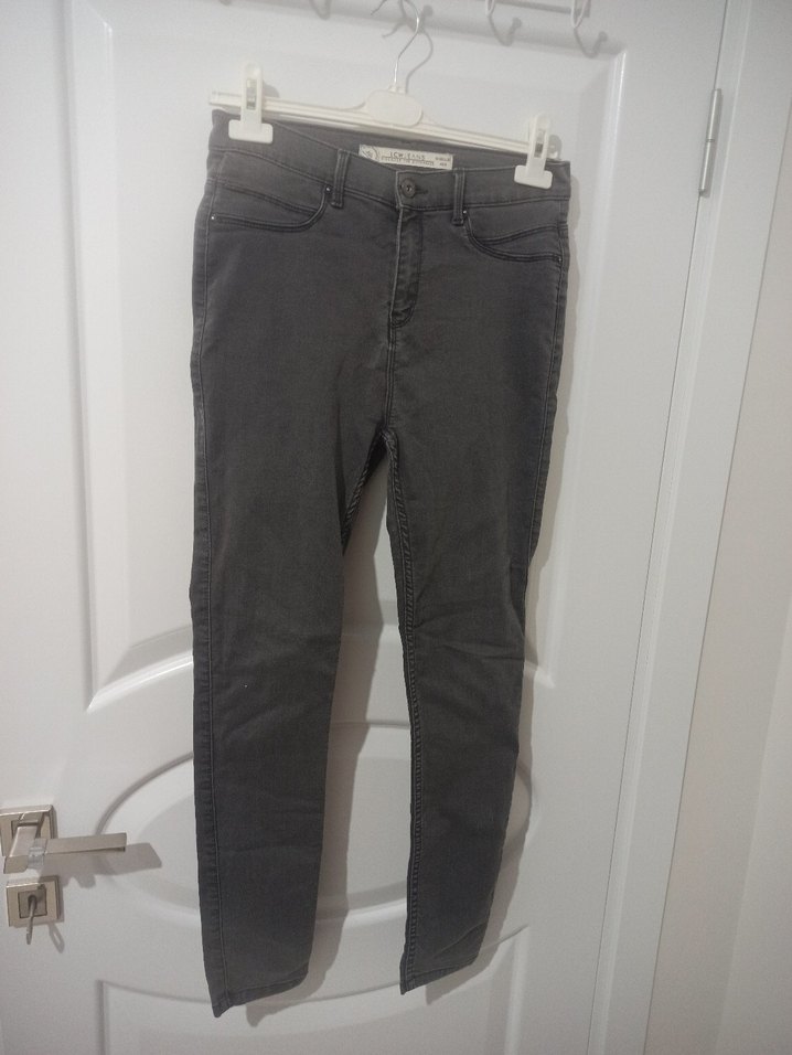 Gri renk, ince kesim denim pantolon midi boyda, desen içermeyen ve günlük kullanıma uygun rahat bir sokak stili sunar.