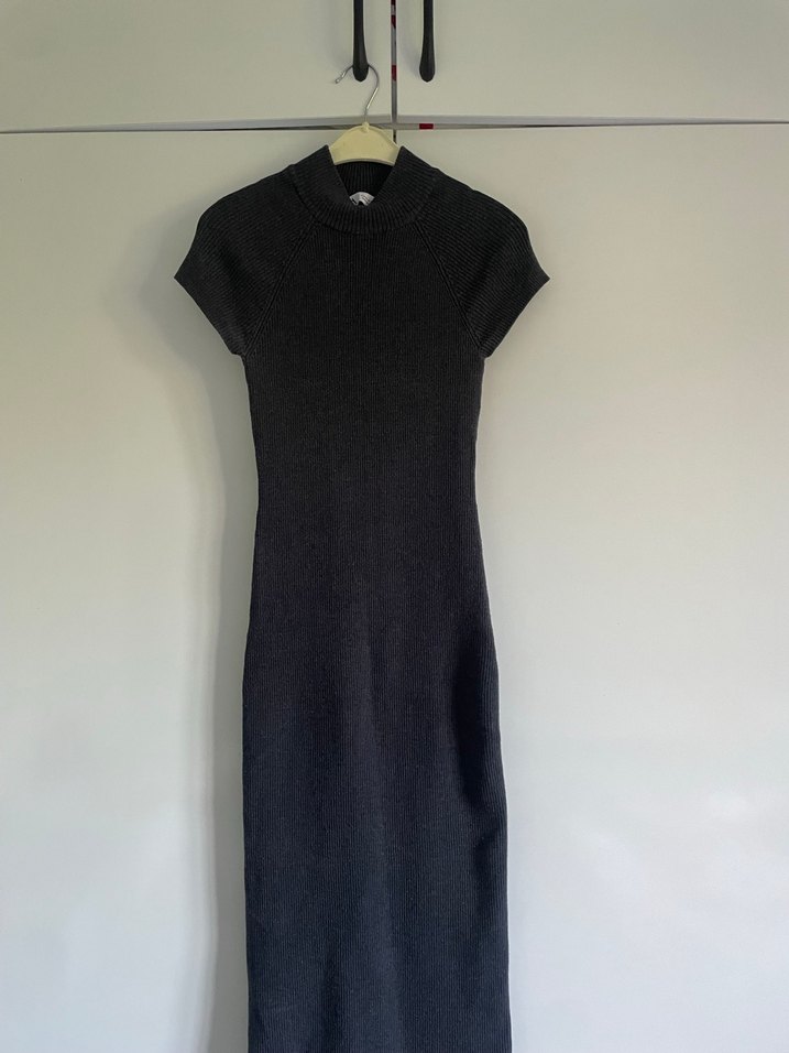 gri ince örgülü, uzun ve vücuda oturan elbise. Yüksek yakalı ve kolsuz, minimalist gotik tarzına uygundur.