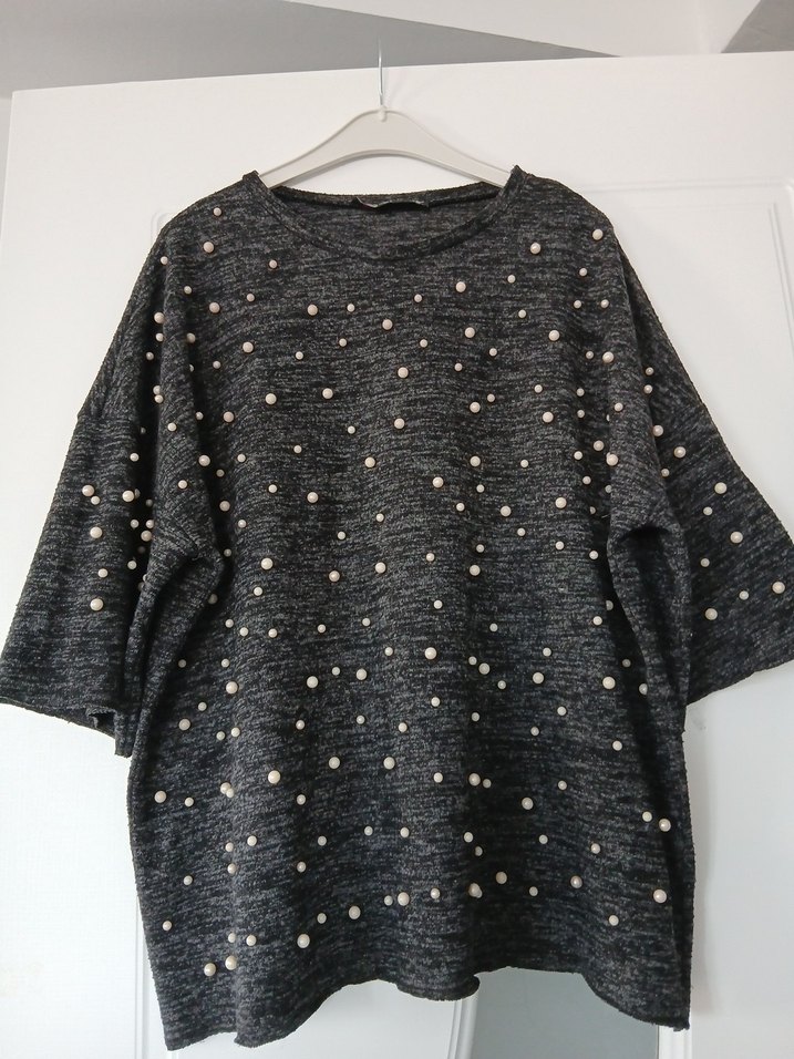 Gri renkli, kısa kollu, inci detaylı, yuvarlak yakalı ve normal uzunlukta, rahat kesim triko kadın kazak.göğüs 64 cm boy 61 cm iyi durumda yumşak penye değil sıcak tutacak bir ürün