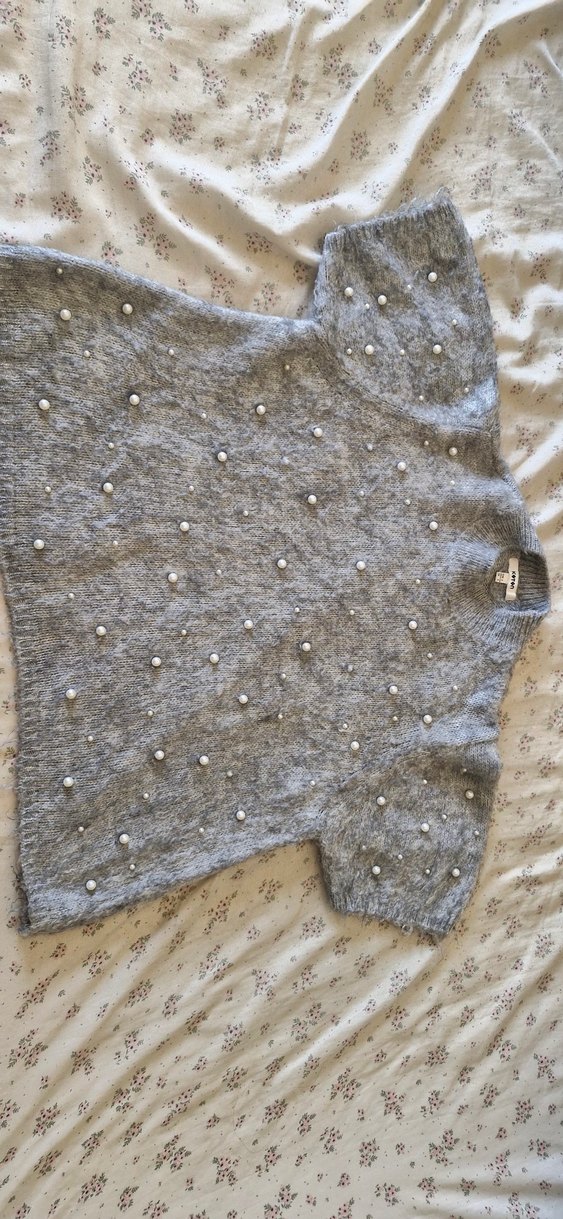 Gri İnci İşlemeli Kısa Kollu Triko Kazak