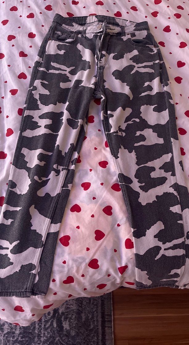 Sentetik kumaştan, düğmeli ve gri kamuflaj desenli bol kesim kadın jean. Midi boy ve sokak stili için uygun.