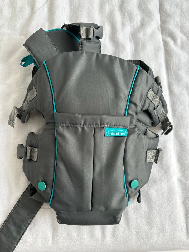 Ayarlanabilir kayışları ve bel yastıklı desteği olan gri Infantino bebek taşıyıcı. Güvenli ve eller serbest taşıma sağlar. Kış bebeği olduğu için az kullanıldı.