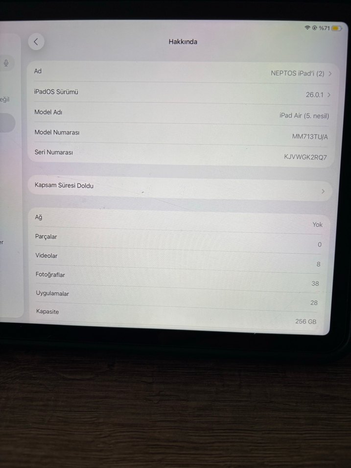 Gri renkli, 5. nesil iPad Air 256 GB depolama alanına sahiptir. Cihaz çok az kullanıldı kutulu, faturalı Türkiye Apple mağazasından alınmıştır. Pil durumu çok iyi seviyededir