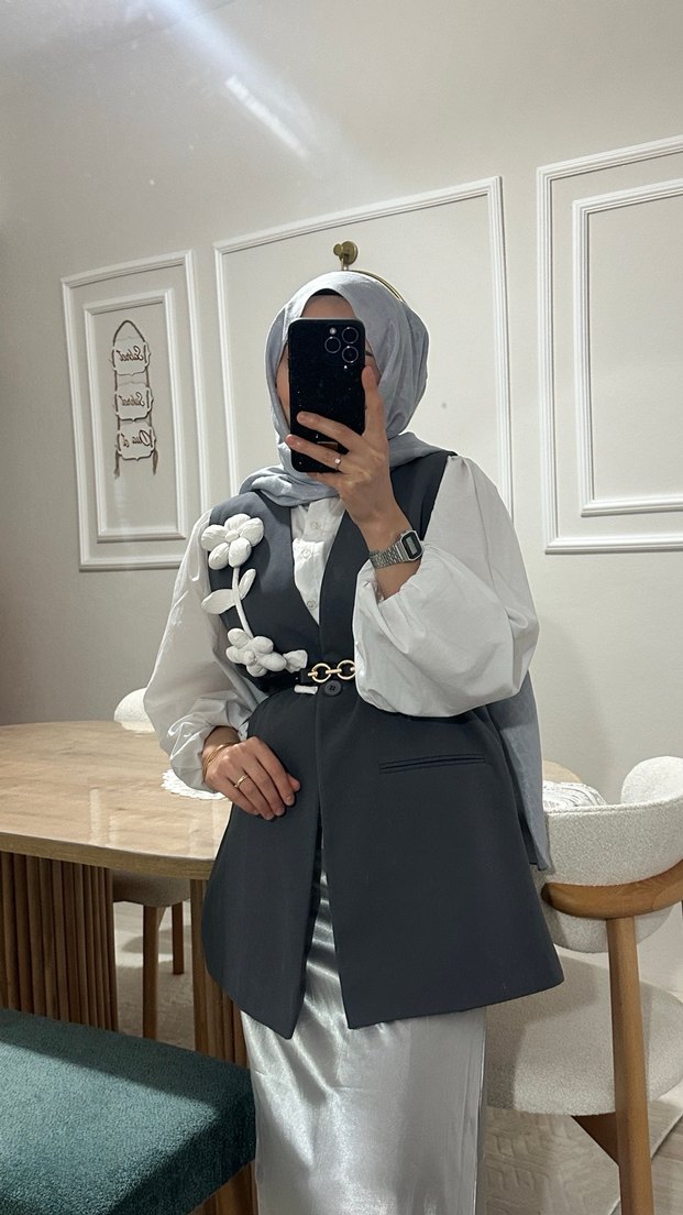 Gri İpek Dokulu Dökümlü Kadın Yelek
