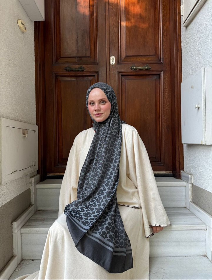 Gri renkte, ipek görünümlü, salaş drapeli kadın şalı. Mütevazı ve geleneksel stilde, bohem dokunuşu ile yumuşak ve rahat bir kullanım sunar.