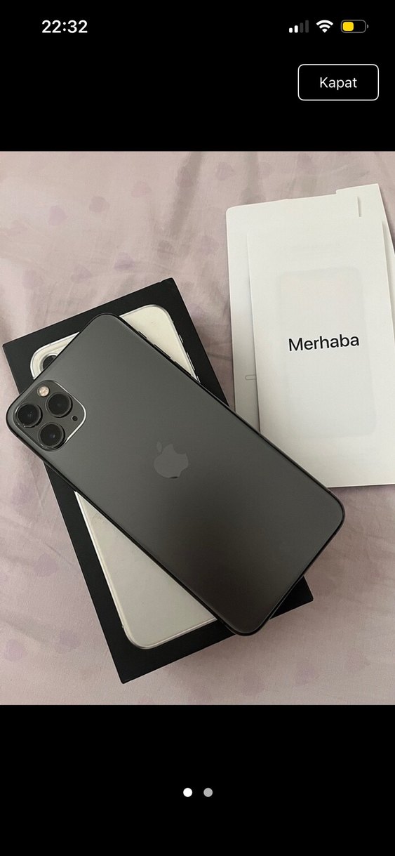 Üçlü arka kameralı gri iPhone 11 Pro Max. Pakette 'Merhaba' yazılı kart bulunmaktadır. 3 sene kullandım temiz ekran yeni değişti sıfır pil sağlığı 77