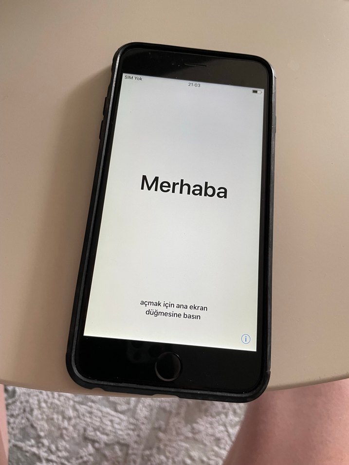 Gri renkte iPhone, Türkçe karşılama ekranında ana ekran düğmesine basılması gerektiğini gösteriyor. Siyah koruyucu kılıf içinde. Sıfırlanmış, tertemizdir. Uzun zamandır kenarda durduğundan kapasitesi hatırladığım kadarıyla 16 gb idi.