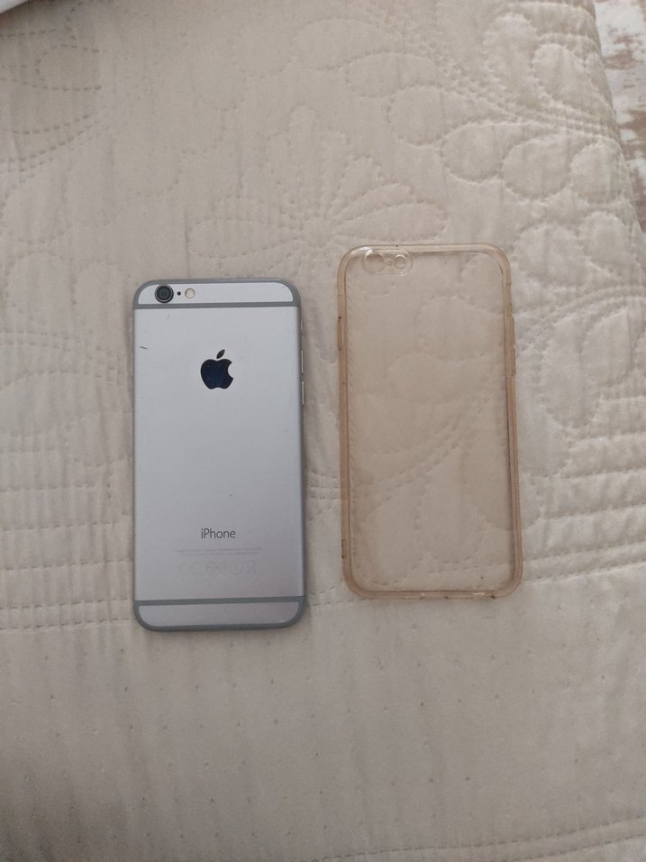 Gri renkte iPhone 6 ve yanında şeffaf koruyucu kılıf. Cihazda hafif kullanım izleri bulunuyor. parça için satıyorum şarja takınca iphone emojisi görünüyor ama açılmıyor