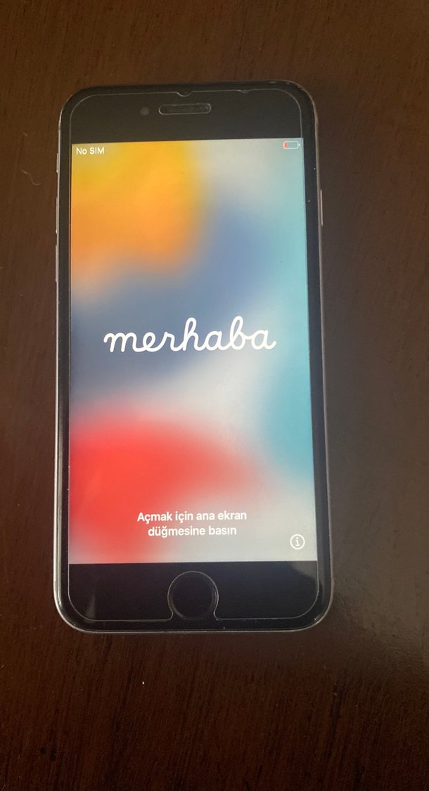 Ana ekran tuşu bulunan koyu gri iPhone, ekranda Türkçe karşılama mesajı gösteriyor. 6s - 64 gb.