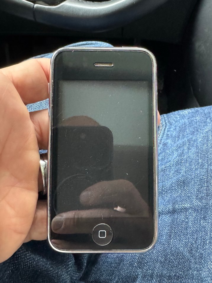 Gri renkte klasik tasarıma sahip, kompakt ekranlı ve ana düğmeli iPhone modeli.