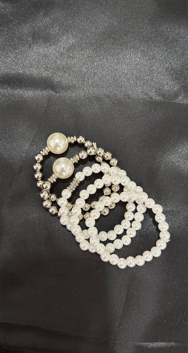 Günlük kullanım için klasik zarafeti yansıtan, gri işlemeli beyaz boncuk detaylı çağdaş kadın bilekliği.