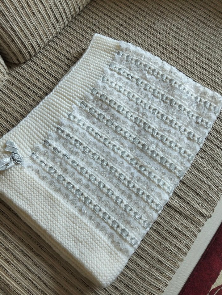 Gri işlemeli desenlere sahip beyaz örgü çocuk battaniyesi, yumuşak dokusuyla sıcaklık sağlar.Ana kucağı üstüne,pusette, bebek arabasında bebeklerin üzerine örtmek için el örgüsü sıfır üründür