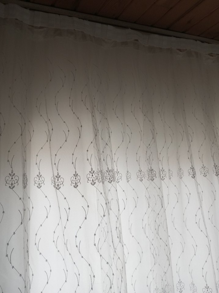 Gri işlemeli desenlere sahip beyaz perde, klasik tarzda zarif bir görünüm sunar. enı 1metre20sm *uzunluk 2metre