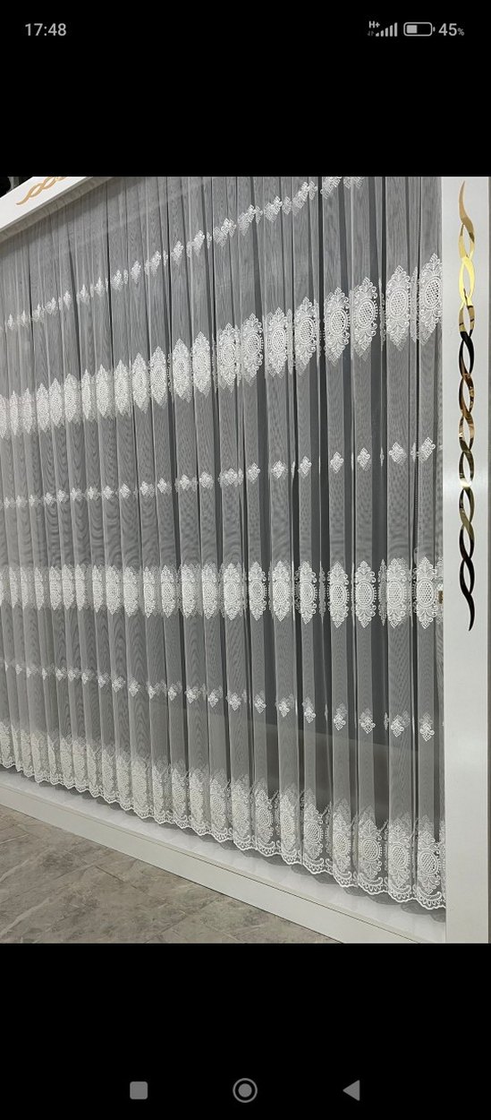 Geleneksel tarzda, gri işlemeli desenlere sahip beyaz tül perde, odanıza zarif bir dokunuş katıyor. istediğiniz ölçülerde dikilmektedir metre fiyatı 250 TL Taç markadır model çeşitlerimiz mevcuttur