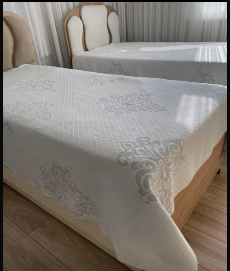Gri işlemeli desenlere sahip beyaz yatak örtüsü, dokulu yüzeyi ile detaylandırılmıştır. İkiz yataklar için uygundur. ️