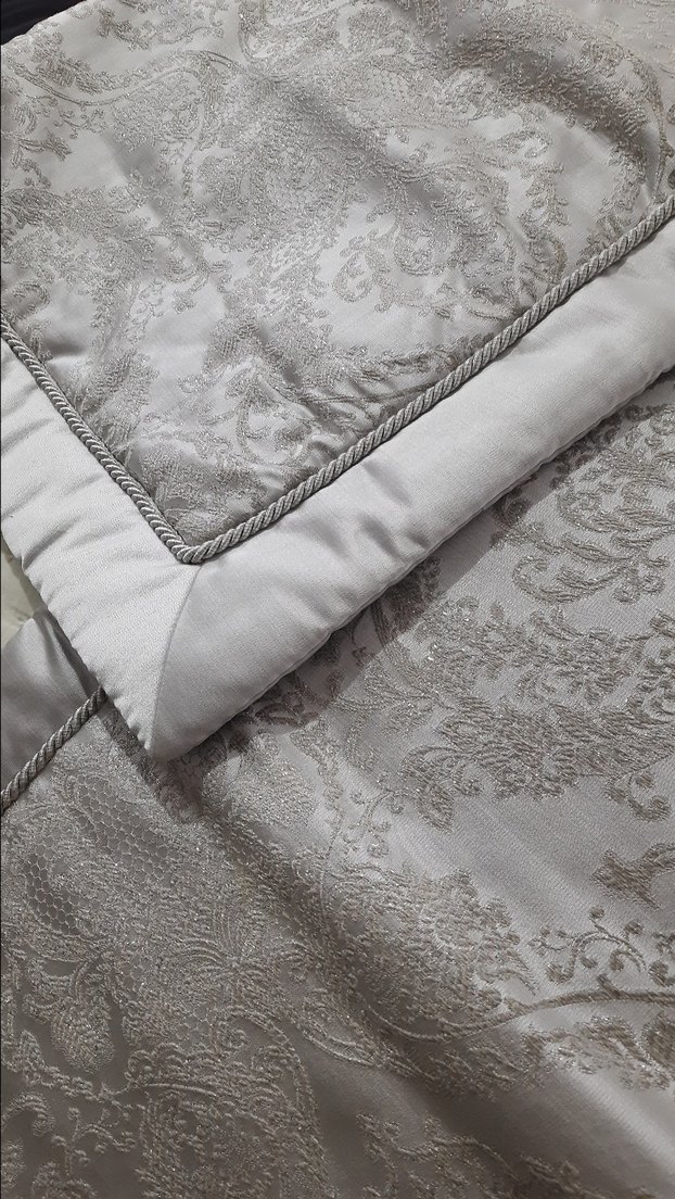 Gri işlemeli çiçek desenlerine sahip beyaz yatak örtüsü, yumuşak dokulu ve ince dekoratif şeritlidir. ️