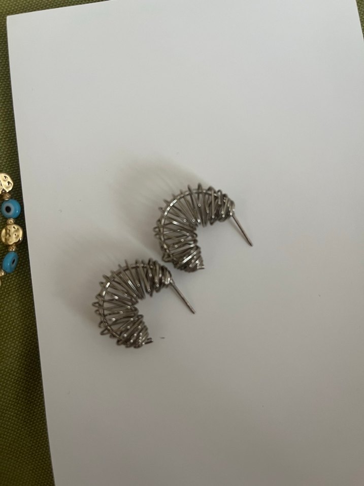 Gri işlemeli, boncuk detaylı mini kısa uzunlukta küpe, avangart parti görünümleri için uygun.