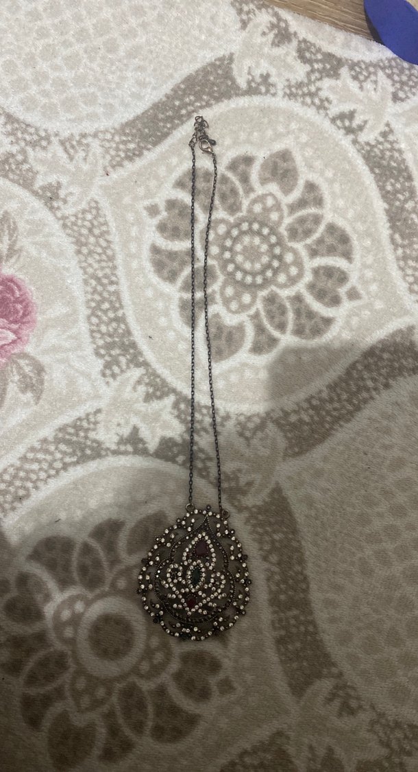 Gri işlemeli ve boncuklu uzun kolye, bohem tarzıyla günlük kullanıma uygundur.