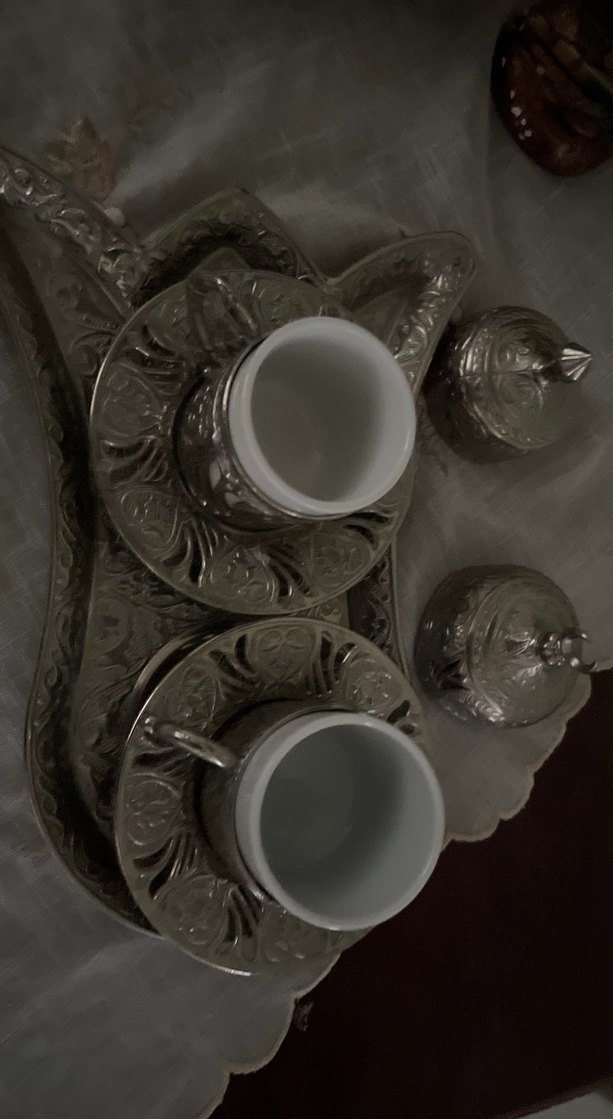 Detaylı işlemeli gri metal tutuculu fincanlar, tabaklar, tepsi ve kapaklı kaplarla servis için uygundur.