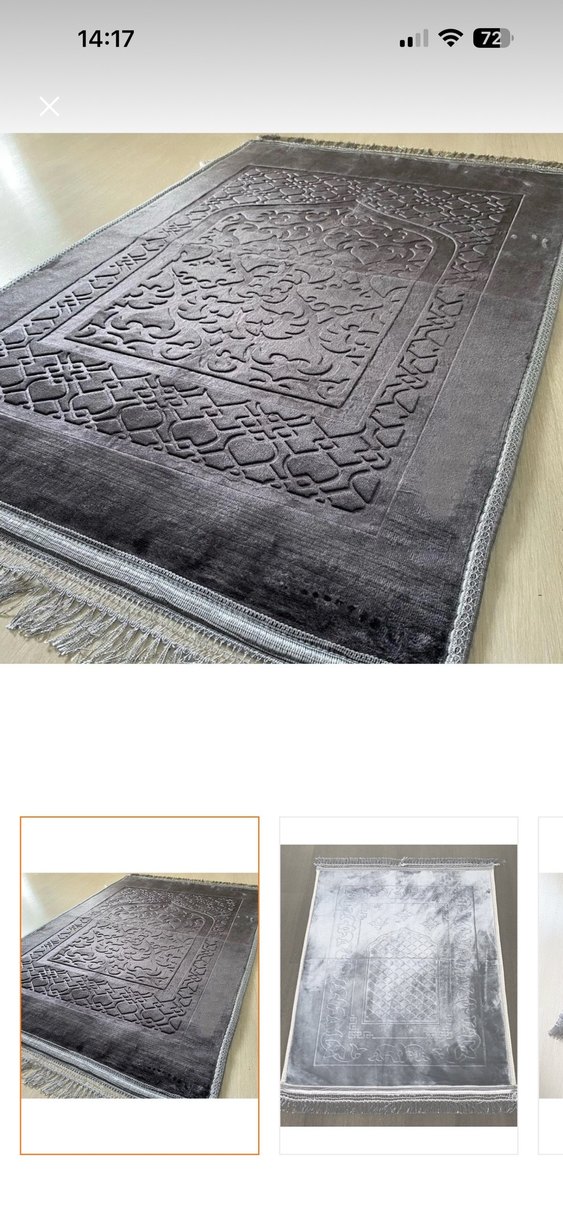 Gri renkte, işlemeli desenlere sahip geleneksel tarzda yumuşak dokulu halı. Kenarlarında püskül detayları bulunur. Peluş secade renkleri mevcut