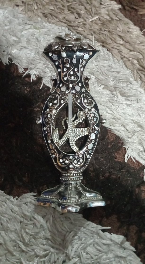 Koyu gri metal vazo, taş işlemeli dekoratif orta parça ve detaylı desenlere sahiptir. 2. el kullanisli öndeki zincir biraz kaymis yapistirici ile yapistirabilirsiniz