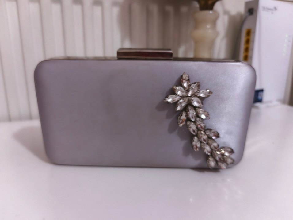 Gri renkte, işlemeli ve payetli detaylara sahip modern klasik tarzda plastik kadın portföy çanta. Düğün gibi özel anlar için uygundur.