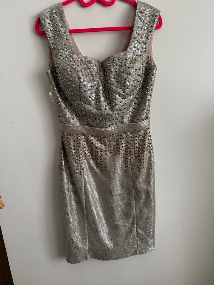 Kolsuz, V yakalı, işlemeli payet detaylı gri midi abiye elbise, vücuda oturan kesimiyle şık bir görünüm sunar. ✨