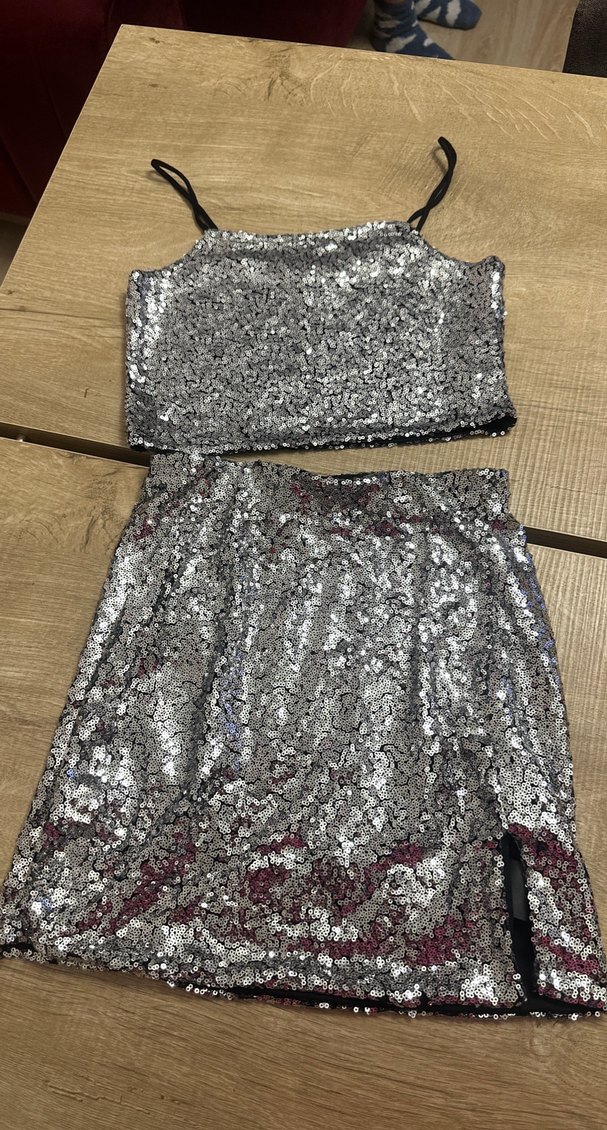Gri renkte, işlemeli ve payetli yüzeye sahip, dar kesim kısa mini etek ve crop göz alıcı parti kombinleri için uygun. ✨